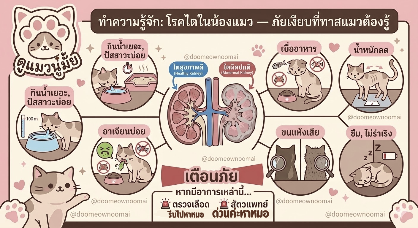 นู๋รู้ว่าเรื่องนี้ทำให้หัวอกทาสแมวอย่างเราสั่นคลอน แต่ความรู้และการช่างสังเกตคือเกราะป้องกันที่ดีที่สุด! วันนี้ DooMeowNooMai จะพาทุกคนไปเจาะลึกทุกแง่มุมของโรคไต ตั้งแต่ประเภทของโรค สัญญาณเตือนที่ห้ามมองข้าม ไปจนถึงวิธีการป้องกันเพื่อให้ลูกรักอยู่กับเราไปนานๆ นะตัว