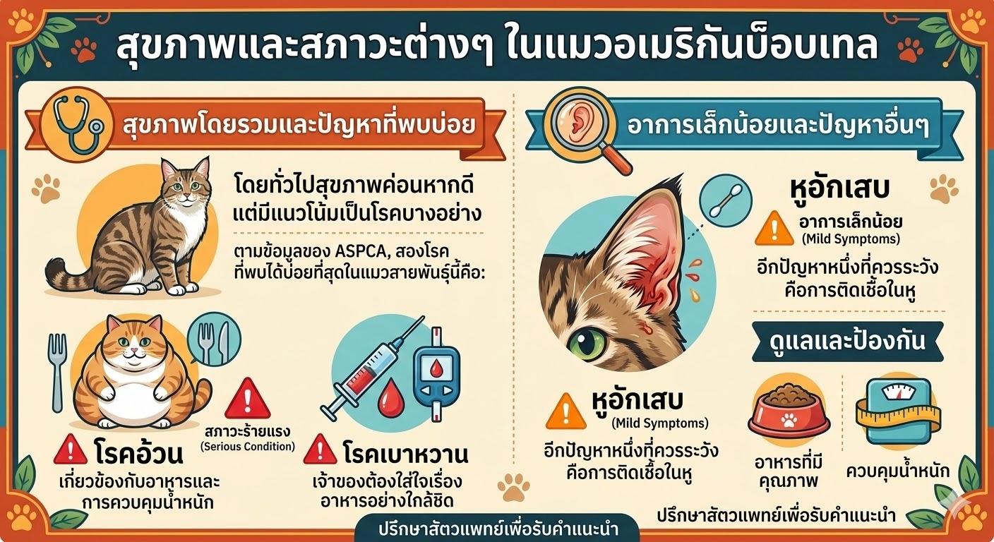 แมวอเมริกันบ็อบเทลเป็นแมวที่มีสุขภาพค่อนข้างดี แต่เช่นเดียวกับแมวสายพันธุ์อื่นๆ พวกมันก็มีแนวโน้มที่จะเป็นโรคบางอย่างได้ ตามข้อมูลของ ASPCAสองโรคที่พบได้บ่อยที่สุดในแมวสายพันธุ์นี้คือ โรคอ้วนและโรคเบาหวาน